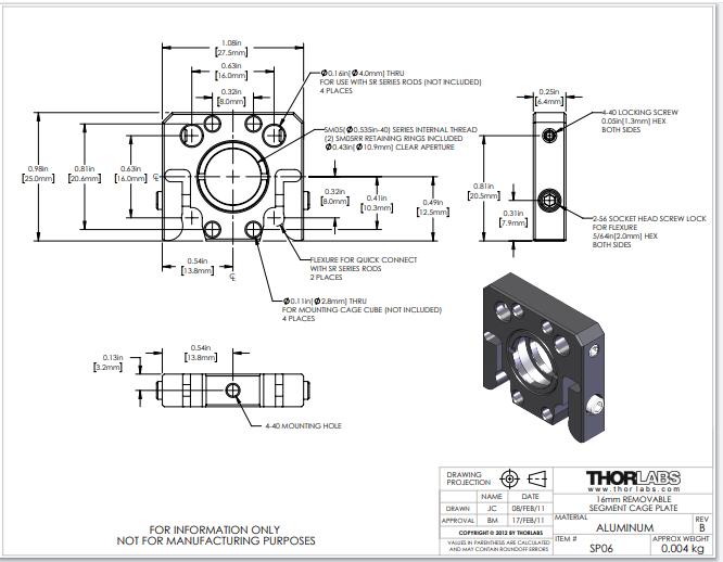 Thorlabs索雷博     SP06 - 可整段拆卸的16 mm笼板
