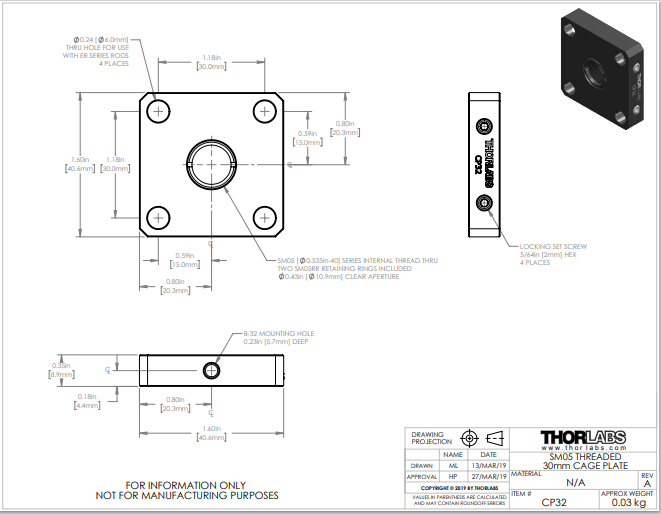 Thorlabs索雷博 CP32 - SM05螺纹30 mm笼板