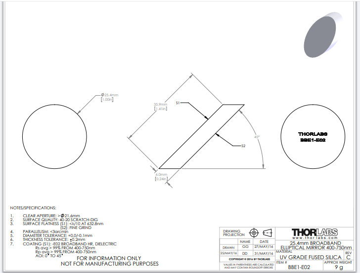 Thorlabs索雷博 BBE1-E02 椭圆反射镜