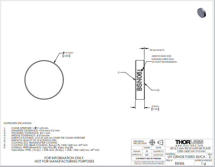 Thorlabs索雷博       BSN06   Ø1/2英寸UVFS分光片