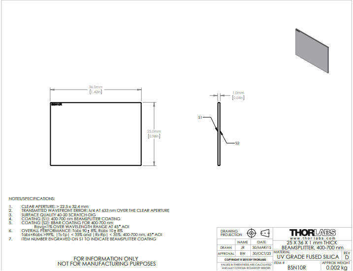Thorlabs索雷博 BSN10R 紫外熔融石英平板分束镜