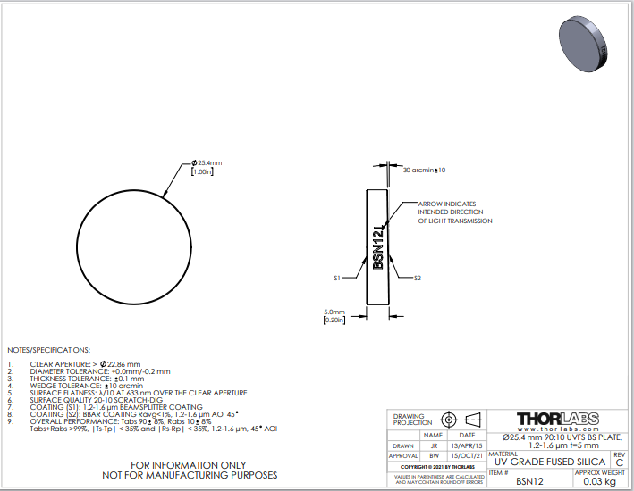 Thorlabs索雷博       BSN12   Ø1英寸UVFS分光片