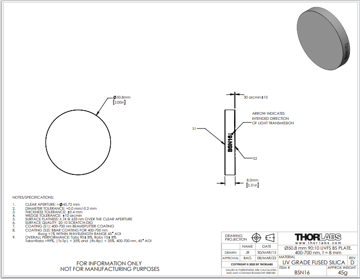 Thorlabs索雷博 BSN16 紫外熔融石英平板分束镜