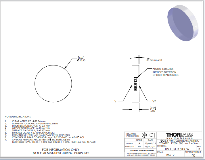 Thorlabs索雷博       BSS12   Ø1英寸UVFS分光片
