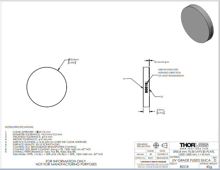 Thorlabs索雷博 BSS18 Ø2英寸UVFS分光片