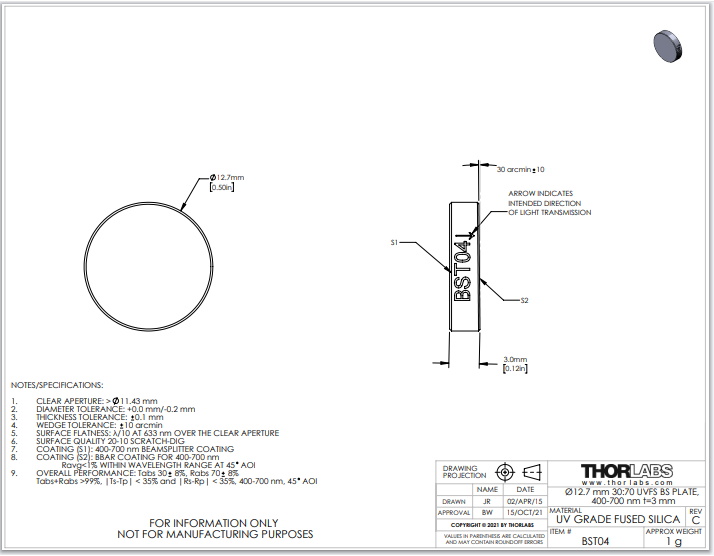 Thorlabs索雷博 BST04 紫外熔融石英平板分束镜