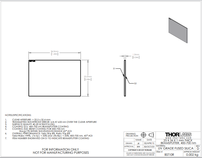 Thorlabs索雷博 BST10R 紫外熔融石英平板分束镜