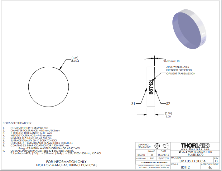 Thorlabs索雷博 BST12 Ø1英寸UVFS分光片