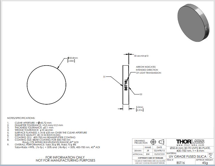 Thorlabs索雷博 BST16 紫外熔融石英平板分束镜