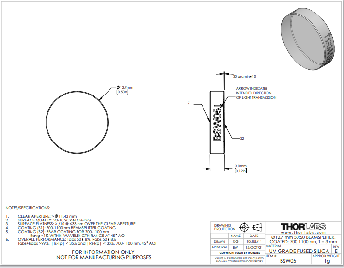 Thorlabs索雷博 BSW05 平板分束镜