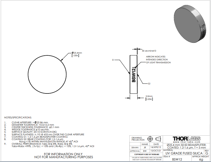 Thorlabs索雷博 BSW12 Ø1英寸UVFS分光片
