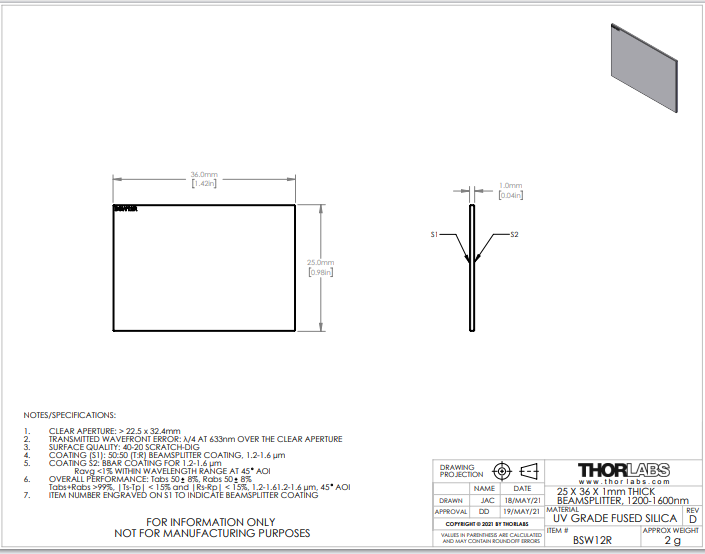 Thorlabs索雷博       BSW12R   UVFS平板分束镜