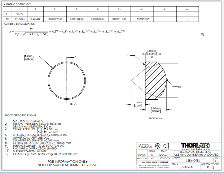Thorlabs索雷博 355392-A 非球面透镜