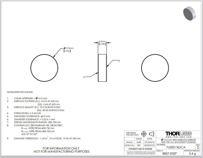 Thorlabs索雷博 BB07-E02P 背面抛光反射镜