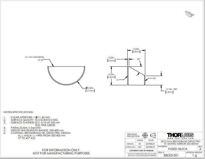 Thorlabs索雷博 BBD05-E01 D形反射镜