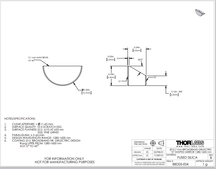 Thorlabs索雷博 BBD05-E04 D形反射镜