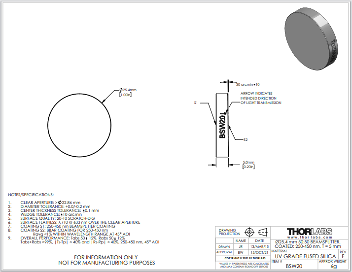 Thorlabs索雷博       BSW20   紫外熔融石英平板分束镜