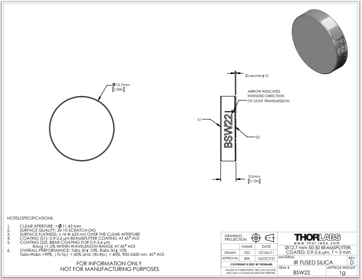 Thorlabs索雷博 BSW22 红外熔融石英平板分束镜
