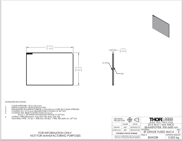 Thorlabs索雷博 BSW23R 红外熔融石英平板分束镜