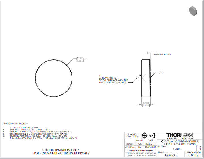 Thorlabs索雷博       BSW505   氟化钙平板分束镜
