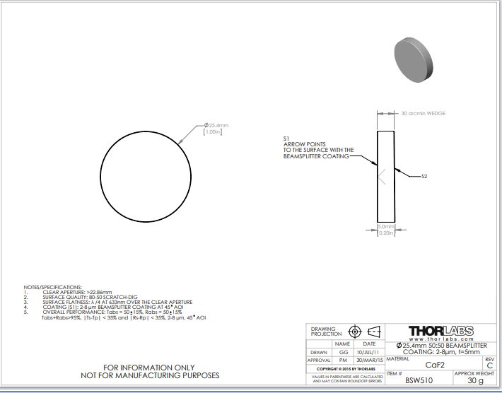 Thorlabs索雷博 BSW510 氟化钙平板分束镜