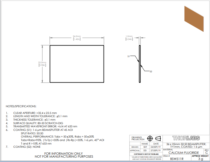 Thorlabs索雷博 BSW511R 氟化钙平板分束镜