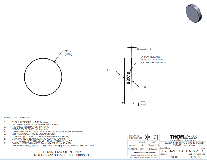 Thorlabs索雷博       BSX10   紫外熔融石英平板分束镜