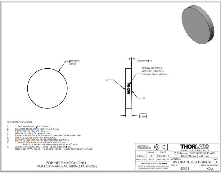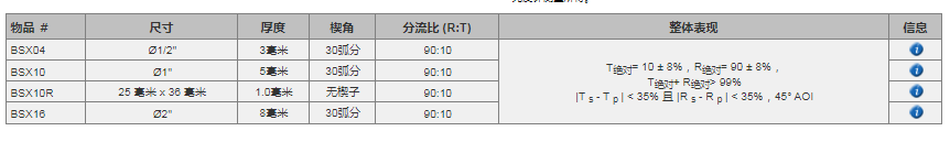 Thorlabs索雷博       BSX16   紫外熔融石英平板分束镜