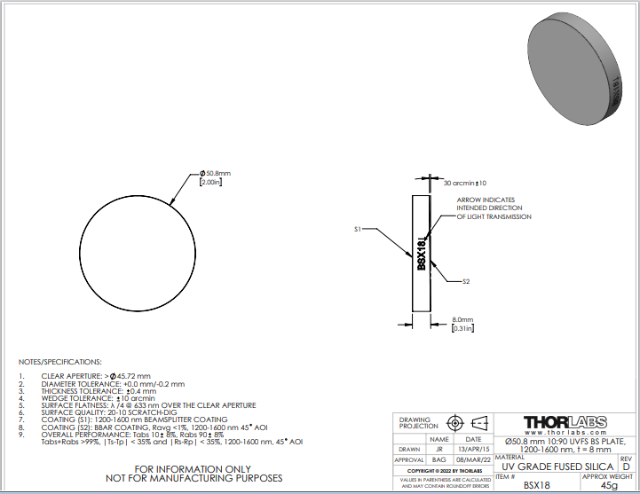 Thorlabs索雷博       BSX18   Ø2英寸UVFS分光片