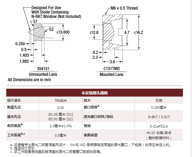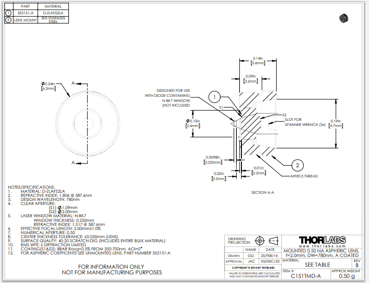Thorlabs索雷博 C151TMD-A 非球面透镜