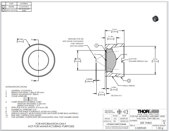 Thorlabs索雷博 C230TMD 非球面透镜