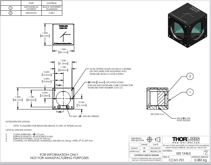 Thorlabs索雷博 CCM1-F01 转向镜,紫外增强铝膜