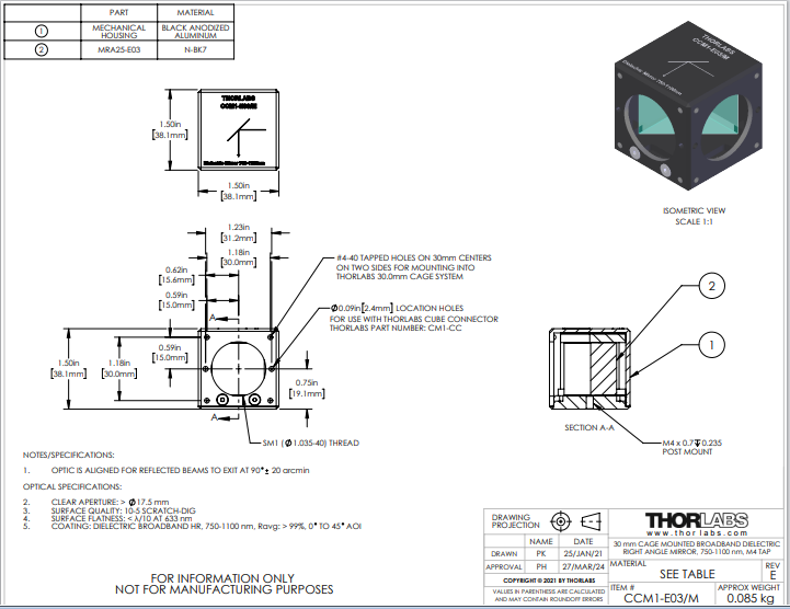 Thorlabs索雷博 CCM1-E03/M 转向镜,E03介质膜