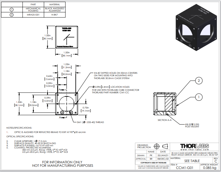 Thorlabs索雷博 CCM1-G01 转向镜,带保护层的铝膜