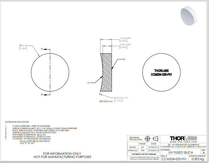 Thorlabs索雷博       CCM254-025-F01   凹形柱面反射镜