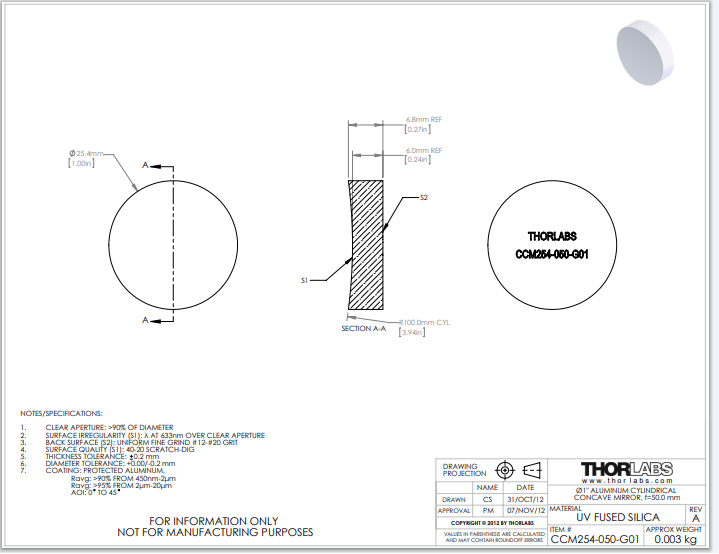 Thorlabs索雷博 CCM254-050-G01 凹形柱面反射镜