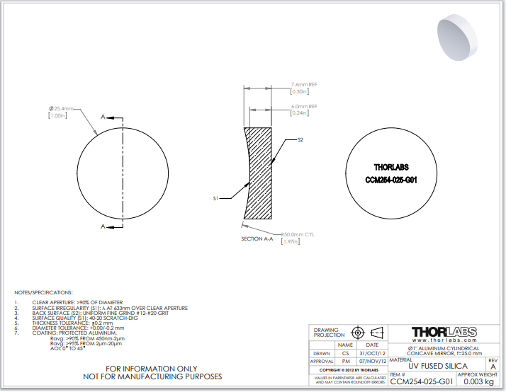 Thorlabs索雷博 CCM254-025-G01 凹形柱面反射镜