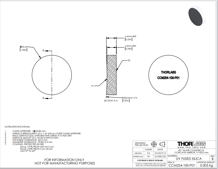Thorlabs索雷博 CCM254-100-P01 凹形柱面反射镜