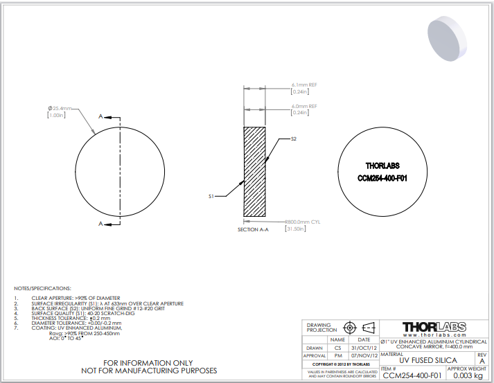 Thorlabs索雷博 CCM254-400-F01 凹形柱面反射镜