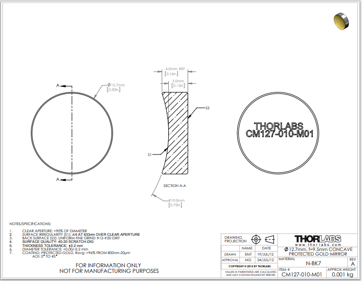 Thorlabs索雷博       CM127-010-M01   镀金凹面镜