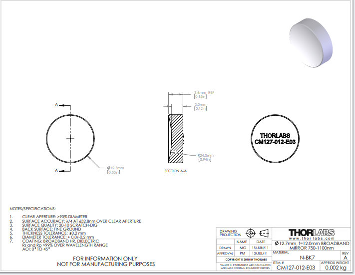 Thorlabs索雷博 CM127-012-E03 Ø1/2英寸介质膜凹面反射镜