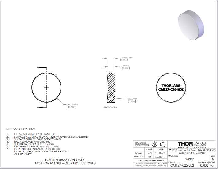 Thorlabs索雷博 CM127-025-E02 Ø1/2英寸介质膜凹面反射镜