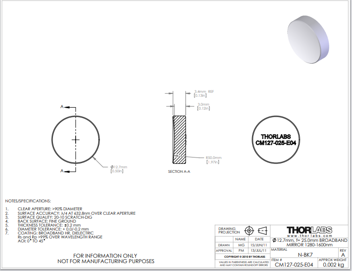 Thorlabs索雷博 CM127-025-E04 Ø1/2英寸介质膜凹面反射镜