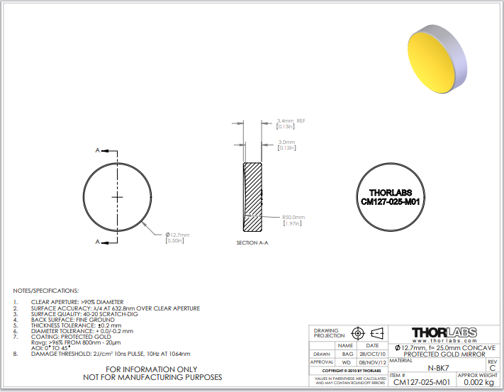 Thorlabs索雷博 CM127-025-M01 镀金凹面镜