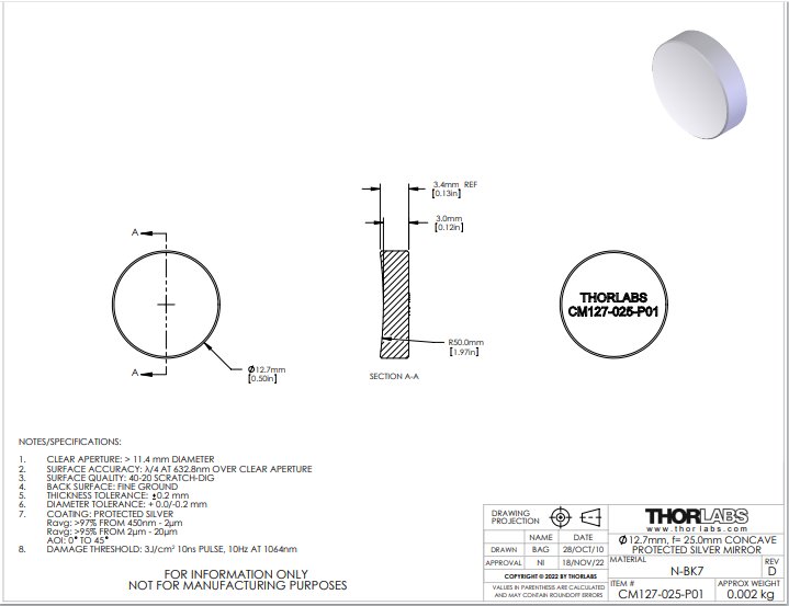 Thorlabs索雷博 CM127-025-P01 镀银凹面反射镜