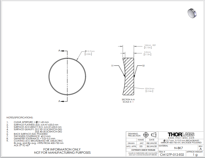 Thorlabs索雷博 CM127P-012-E02 介质膜凹面镜