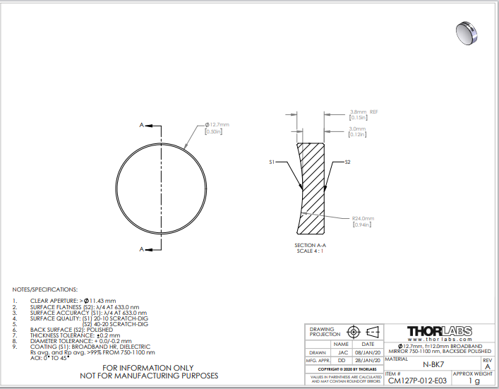 Thorlabs索雷博 CM127P-012-E03 介质膜凹面镜