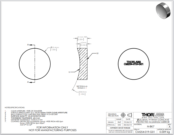 Thorlabs索雷博 CM254-019-G01 镀铝凹面镜