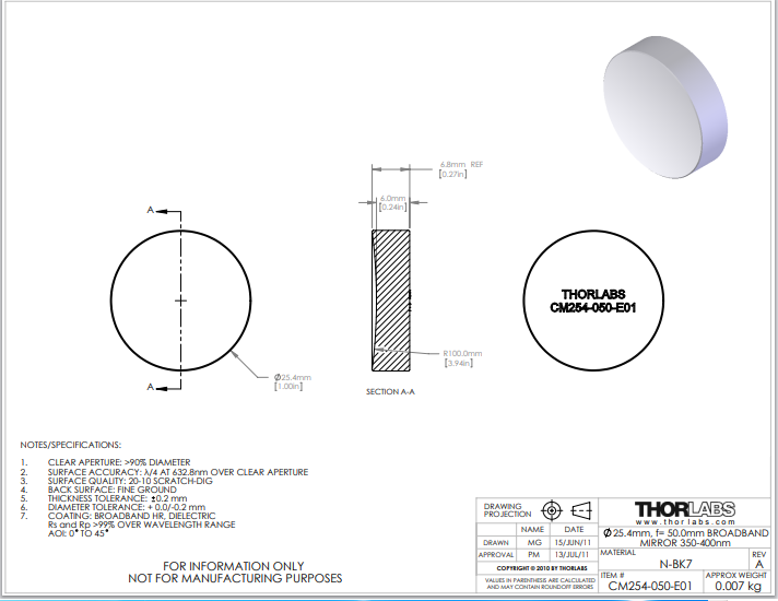 Thorlabs索雷博 CM254-050-E01 Ø1英寸介质膜凹面反射镜