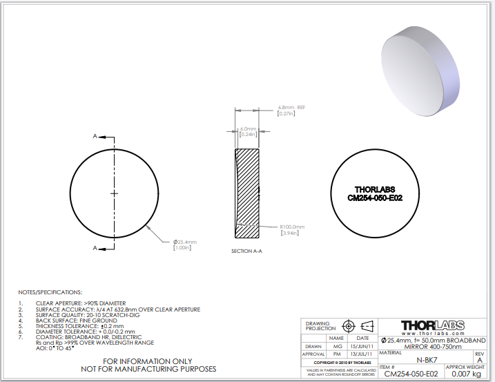 Thorlabs索雷博 CM254-050-E02 介质膜凹面反射镜
